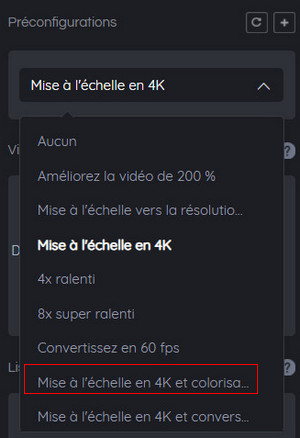 Vous pouvez également accéder à la section Préconfigurations et sélectionner les options Mise à l'échelle en 4K et colorisation.